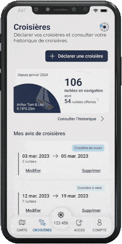 Dans l’onglet “Croisières”, déclarez vos croisières en sélectionnant les dates de votre choix. Vous avez aussi accès à votre historique de croisières, le nombre de nuitées en navigation et le nombre de nuitées déjà offertes dans l’année.